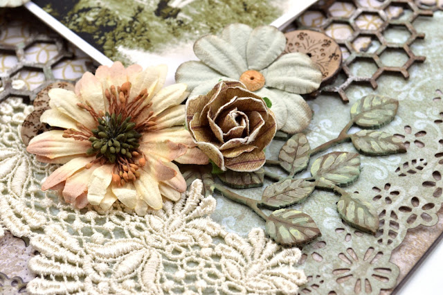 The lace flowers and berry clusters were misted with Lindy's Stamp Gang spray Pink Ladies Pink and Walnut Gold Glimmer Mist. I dabbed the excess off the lace flowers with paper towel to lift some of the colour and lighten them.